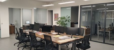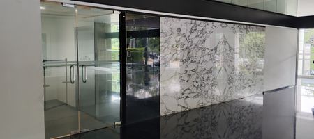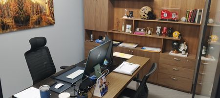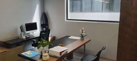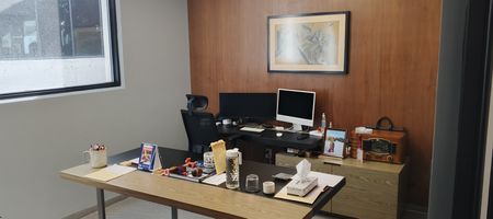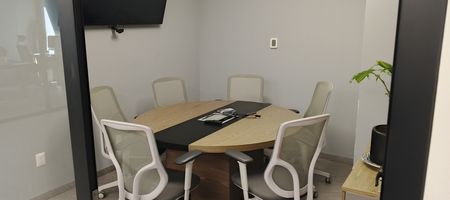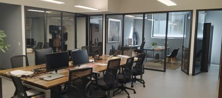 La oficina tiene acceso por lobby del edificio, con acceso controlado con clave y puertas de cristal con magneto, entrando tiene la recepción, con una salita de espera, área de trabajo central abierta, rodeada por 8 oficinas con divisiones de tabla-roca y canceles de aluminio con cristal, área con cocineta, área de limpieza y baños privados para damas y caballeros.