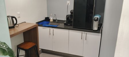 Plafones en techo con luz led, pisos cerámicos aire acondicionado, muy buena iluminación y una bodeguita para guardado.