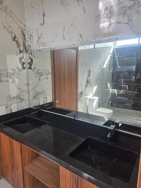 Recámaras Secundarias: Dos amplias habitaciones con clósets de madera, compartiendo un baño equipado con doble lavabo de mármol y cancelería de vidrio templado.