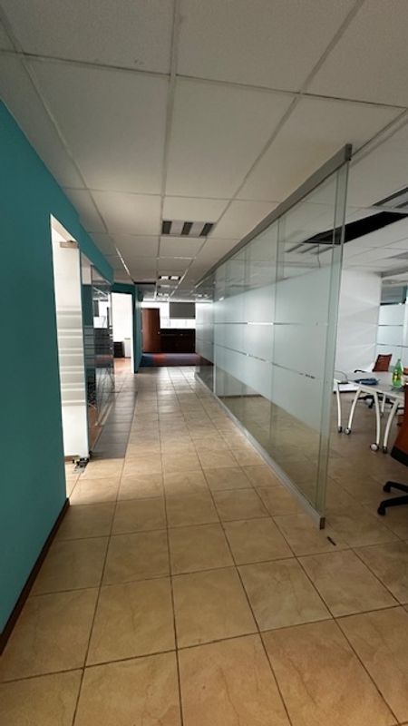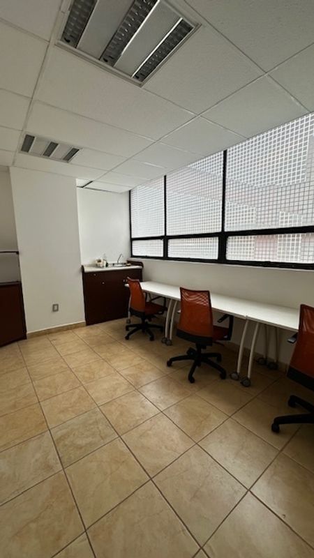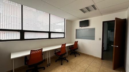 Recepción, 7 cubículos, sala de juntas, oficina director con baño, cocineta, bodega, espacio para servidor. Persianas instaladas y muebles empotrados. Mini splits. 2 estacionamientos.