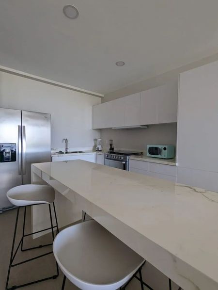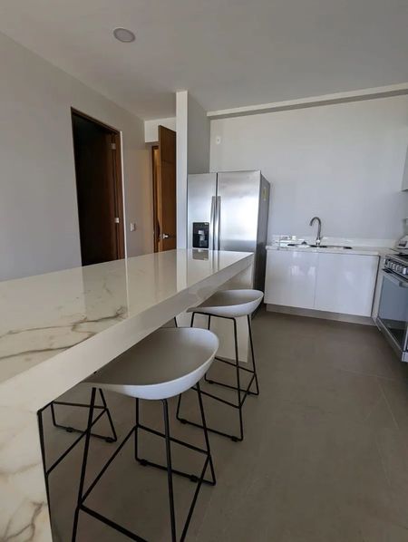• Cocina abierta equipada con: carpintería, isla, refrigerador y estufa de Gas.