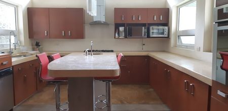 cuenta con 4 recamaras, 5 baños, lavandería, cuarto de juegos, cuarto de servicio, casa para invitados, jardines, bardeada, totalmente amueblada, piso hidronico, bodega, 5 terrazas, palapa con baño, asador y alberca.