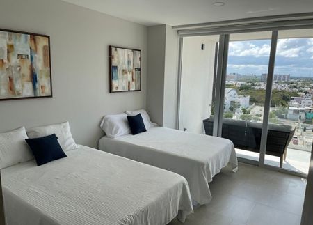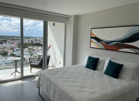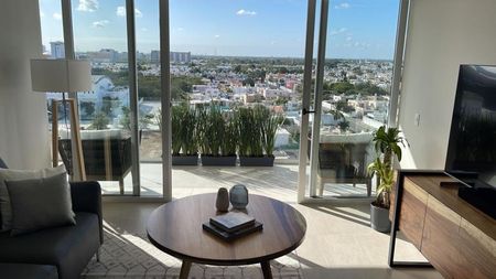 Situado en el Edificio Montejo Plaza, este departamento destaca por su arquitectura de primer nivel, amplios espacios y un balcón con una vista espectacular. Está totalmente amueblado y equipado con acabados de lujo, brindando un ambiente elegante y confortable.