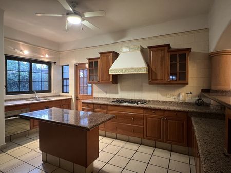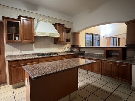 La cocina muy bien equipada, con paredes cubiertas de azulejo, barra de granito, gabinetes con luz e isla, con salida hacia la cochera y el área de servicio.