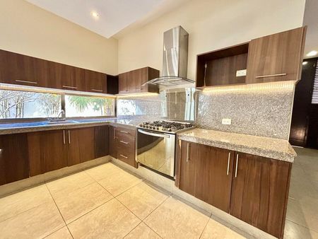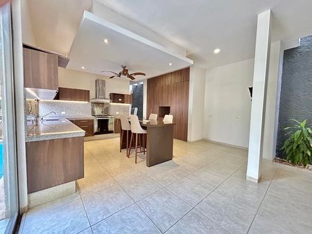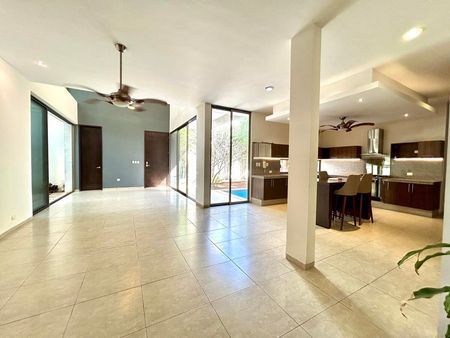 Cuenta con 4 Recámaras c/u con Baño Propio, Cuarto de servicio con Baño, Cochera techada con portón eléctrico, Amplia cocina vestida y equipada y Piscina. Sus espacios interiores son bastante amplios.
