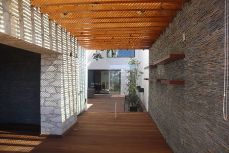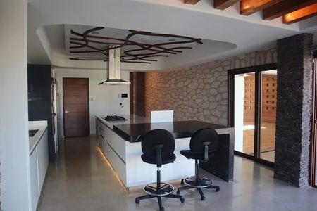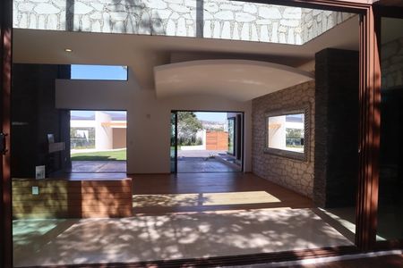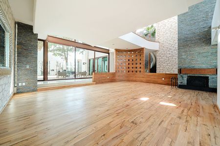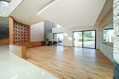 toda la planta baja. Con detalles en muros de volumetría y recubrimientos de piedra caliche martelinada que recorren gran espacio de la casa y pisos deck de Madera Cumaru brasileña. Diseñado para integrar un domo en el techo.