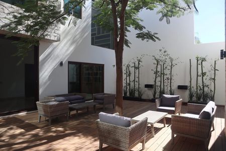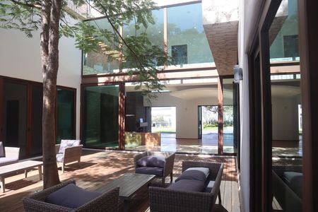 Terraza interna: Espacio central de la casa, rodeada de grandes ventanales con un tabachín jumbo traído de Cuernavaca y una fuente que ameniza