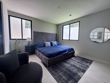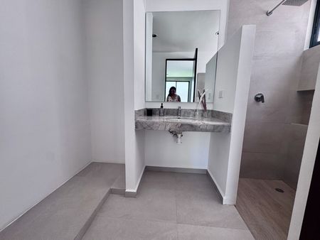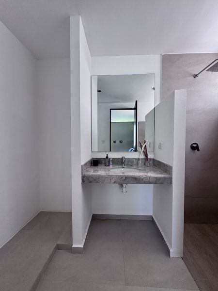 Recámara principal con área de closet vestidor y baño completo.