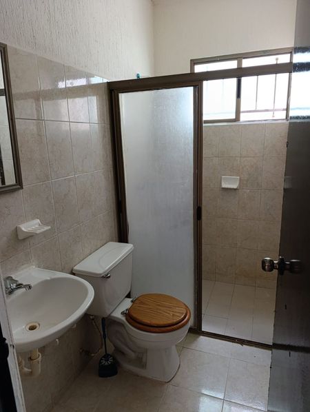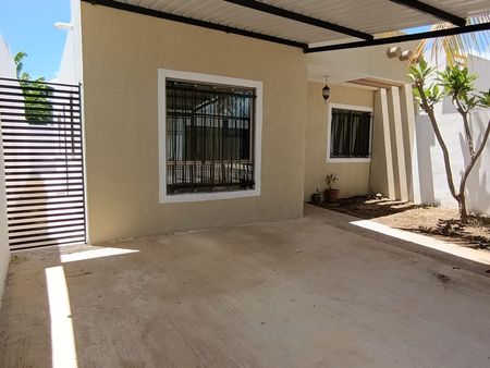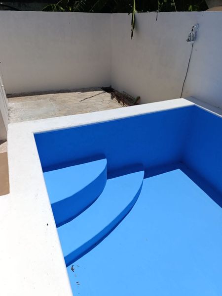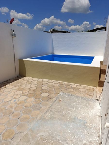 Casa con piscina | Totalmente bardeada | Reja al frente | Protectores en ventanas Casa de Dos habitaciones | Un baño completo | Sala | Comedor | Cocina con barra desayunador | Área de lavado | Pasillo lateral | Cochera techada para un auto | Área de jardín
