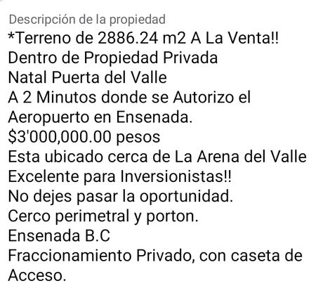 Terreno en Venta 2886 m2Natal puerta del ValleA 5 min del Aeropuerto autorizado en chichihuasA 3 min de Arena del VallePropiedad Privada