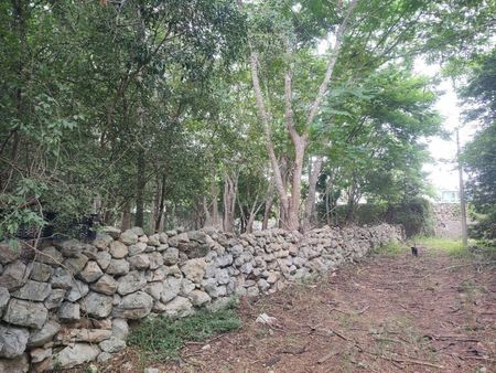 Es regular y plano con barda en forma de L al fondo y a la derecha, colindando con la privada San José Cholul.