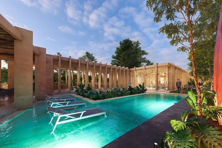 Terraza social con piscina con acabado chukum