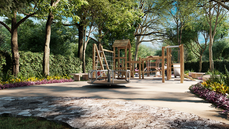 Zona recreativa con piscina para adultos e infantil, área de juegos infantiles, y ciclo-vía.