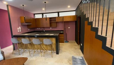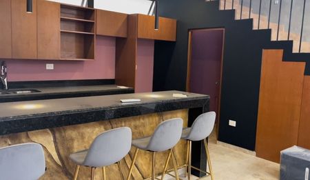* Sala-comedor-cocina con barra de granito, ventanal, y medio baño social.