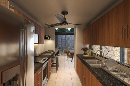 Cuenta con 2 plantas, cada Townhouse cuenta con 2 recámaras con baños, sala, comedor, cocina, alberca privada y cuarto de servicio con baño.