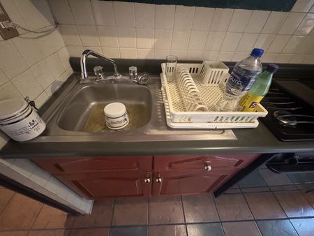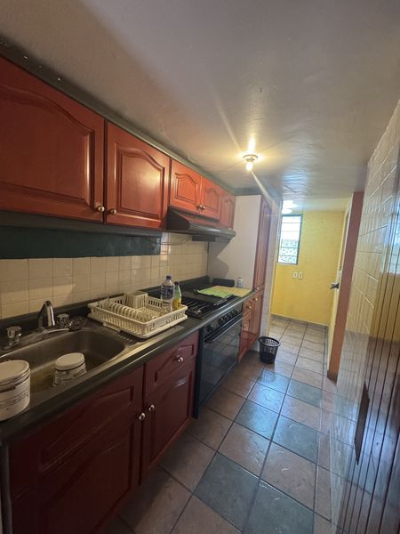 Cocina integral equipada con gabinetes encimeras, despensa y alacena. La estancia y la cocina se abren al jardin posterior el cual es muy bello con cesped y plantas impecables.
