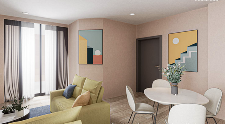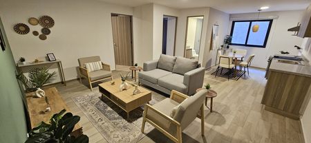 Este departamento interior de sesenta y tres punto cincuenta y siete metros cuadrados ofrece todo lo que necesitas para vivir cómodamente. Consta de dos recámaras, dos baños completos y una estancia que combina sala y comedor, creando un ambiente ideal para relajarte y disfrutar de tus días.