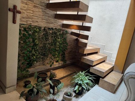 Planta baja: Sala-comedor, cocina integral, estudio muy amplio, recamara con baño completo, área de lavado techada, patio trasero. Planta alta: 3 recámaras, 2 recamaras secundarias con doble altura y cada una con baño completo, recamara principal muy amplia con baño doble lavabo y área de vapor | estacionamiento dos autos | todos los servicios.