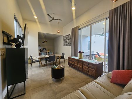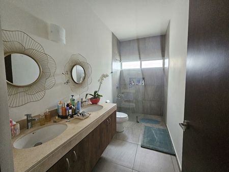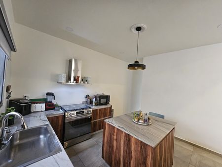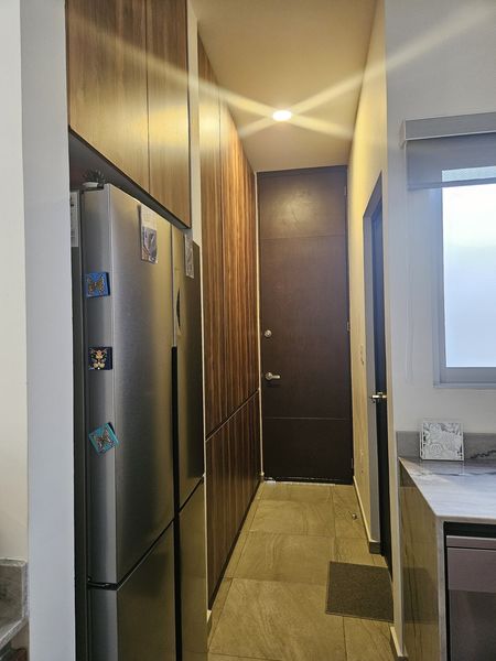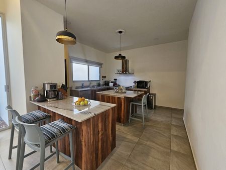 Al entrar a la propiedad te recibe su amplia sala y comedor con techos de muy buena altura llevándote hacia la cocina que esta super equipada con electrónicos refrigerador estufa campana lavadora de traste tarja doble, filtro para beber agua purificada, extractor de alimentos, alacena, gabinetes madera con meseta de granito ,barra desayunador con bancos