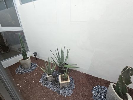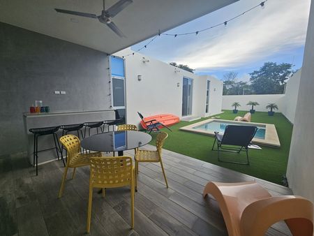 La casa cuenta con piscina en acabado Chukum pasillo lateral de servicio y todo el jardín es pasto artificial para tener menos mantenimiento y larga duración garantía de 10 anos