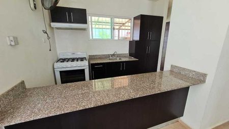 * Cocina integral equipada y mueble de alacena, con puerta mosquitero de herrería qué da al jardín y un tanque de gas.
