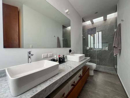 Baño completo para visitas, con acceso desde el área de la alberca