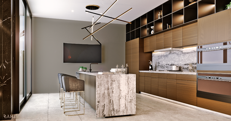 Cocina integral de diseño equipada con campana, parilla, tarja y mezcladora