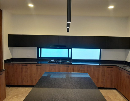 Cocina integral equipada con isla, gavetas superiores e inferiores, alacenas inferiores, parrilla de gas y campana extractora.