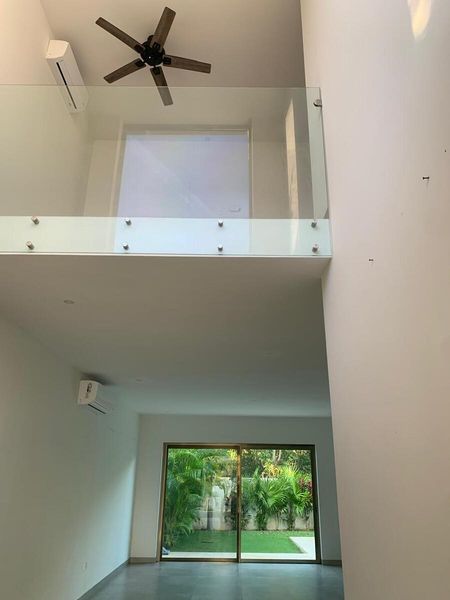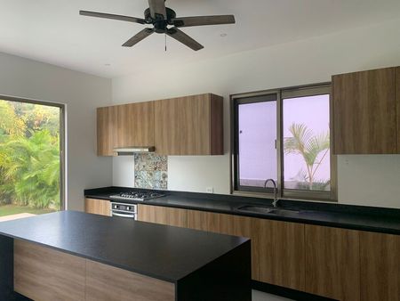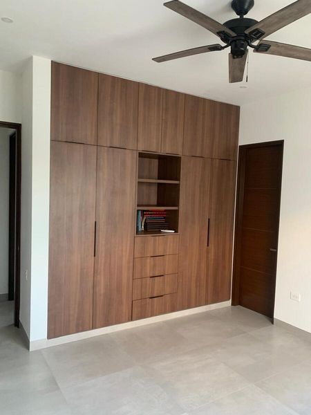 -3 habitaciones con su baño completo, la habitación principal tiene closet vestidor, 2 lavabos, los cristales tienen película para proteger del calor del sol, abanicos y cortinas en las 3 habitaciones, closets de madera sinterizada, área para sala de tv, 8 paneles solares.