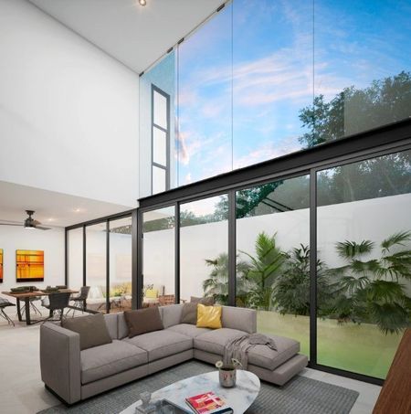-Sala con doble altura ,ventanales amplios con vista a piscina y terraza
