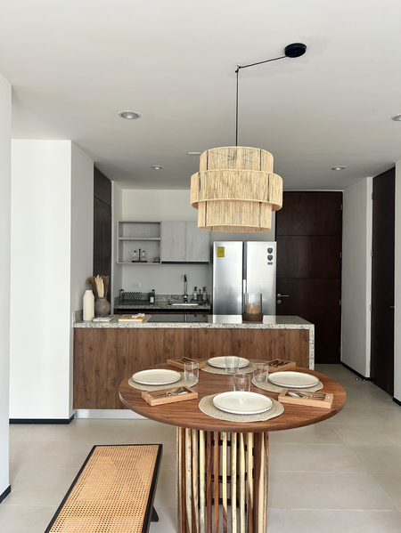 Conformado por sala, comedor, cocina, área de lavado, medio baño y 2 recámaras con espacio para clóset vestidor y baño completo. Rooftop con barra.