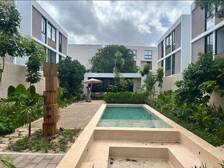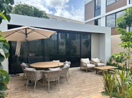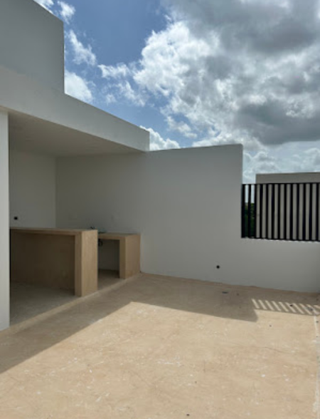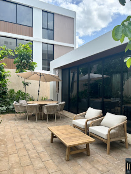 incluye espacios verdes de árboles y plantas de Yucatán, terrazas, piscina, asoleadero, área de grill y un espacio cerrado para eventos y baños.