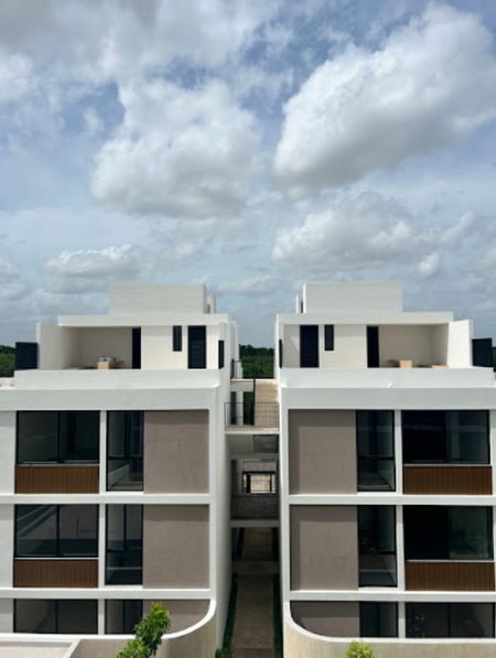 Conformado por 27 departamentos con seguridad y privacidad, divididos en 2 módulos independientes con vistas al exterior y en 3 niveles, con circulaciones y accesos que simulan las vetas de la madera y con elementos naturales que refrescan las fachadas para crear una