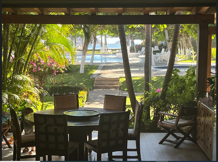Amplia terraza con vistas al jardín y alberca con chapoteadero, estacionamiento techado, hermosos jardines, caseta de acceso controlado, club de playa y acceso directo a la playa.
