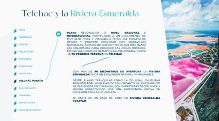 Telchac se encuentra en la Riviera Esmeralda, su playa está reconocida a nivel nacional e internacional, proyectada a un crecimiento de muy alto nivel, la zona está rodeada de hermosos lugares naturales como las lagunas rosadas de Xtampú, la zona arqueológica de Xcambó, los manglares de San Crisanto y avistamiento de flamingos .
